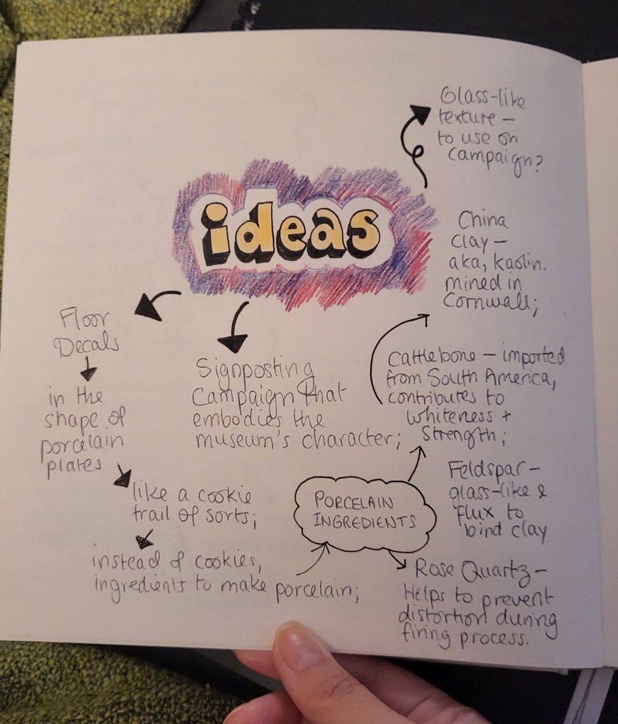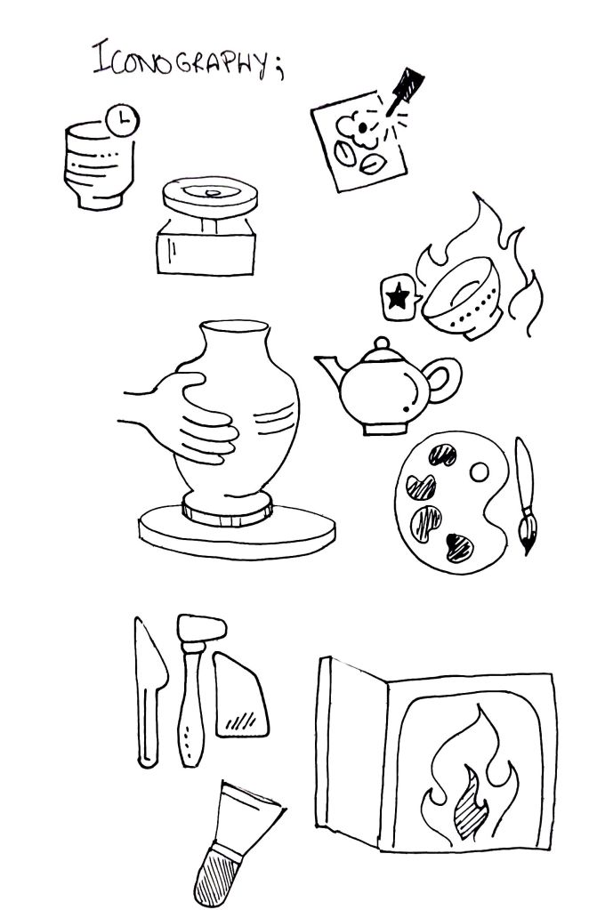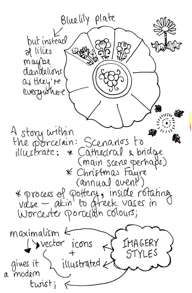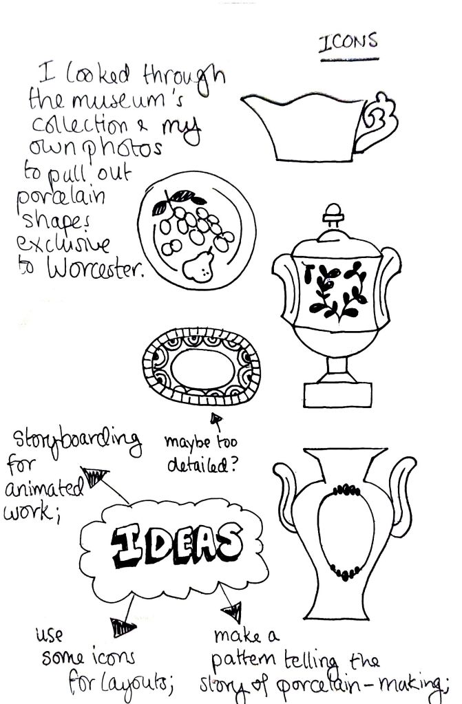 I liked the concept of making a storyboard for the animated totem, but also I wanted to create a waymark/sign posting of sorts for people to find the museum easier. Because of this, I turn to my sketch book for sketches and conceptualisation. The porcelains have always been so detailed and intricate, I thought about ways I could simplify or even modernise these by perhaps creating icons to resemble them.