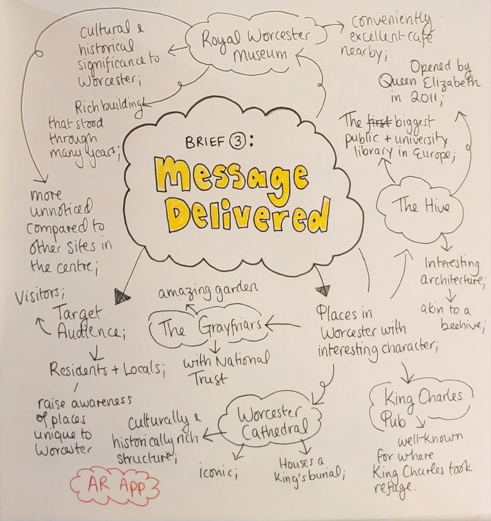 There is a lot of good places in Worcester that I think could represent the character of this town and its cultural and historical value, so I made a mind map of all the perks of the different locations that could symbolise the character of Worcester.