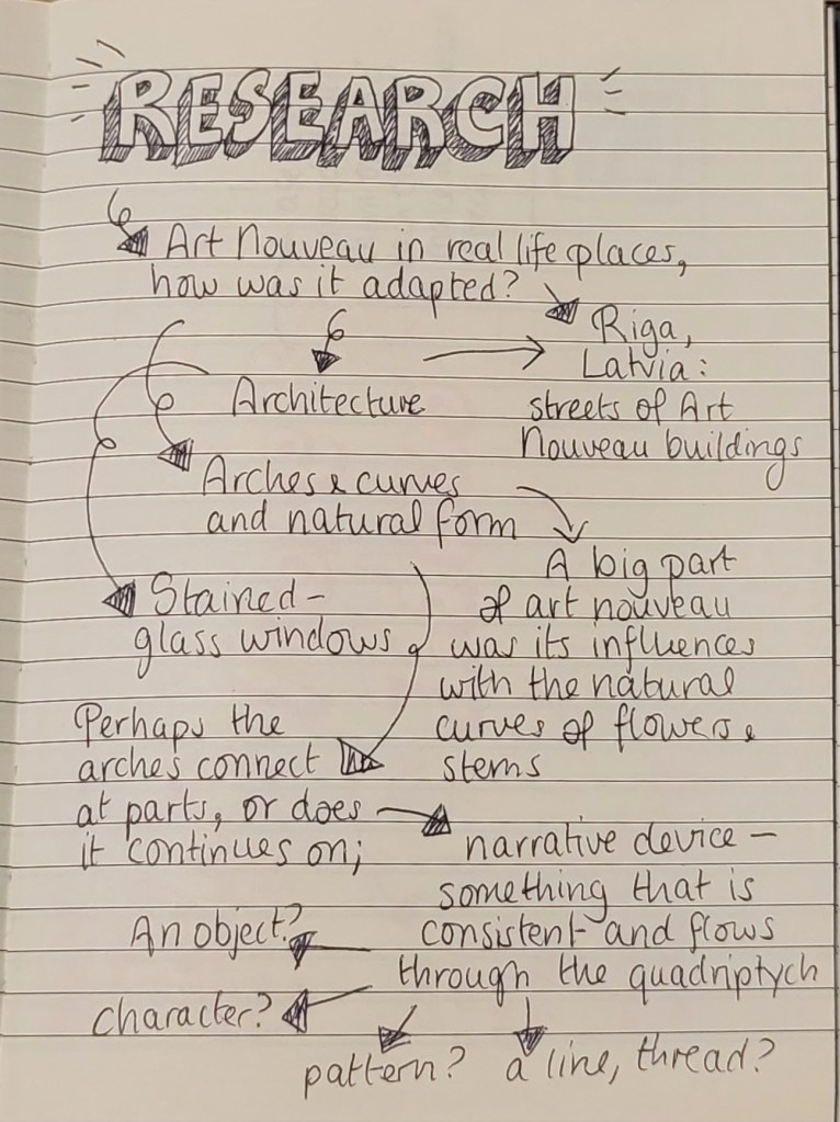 Because of this, I was inspired to make a little world of my own for my quadriptych and still playing on my childhood memories or archways in churches.
