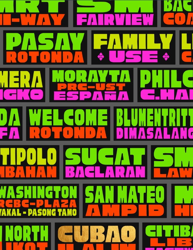 Akin to coaches and buses, Jeepneys have specific stop points and they feature location names to explain the areas they cover. Sometimes, they can be quotes or statements, but nonetheless, they are featured on jeepneys and follow similar styles in typography.