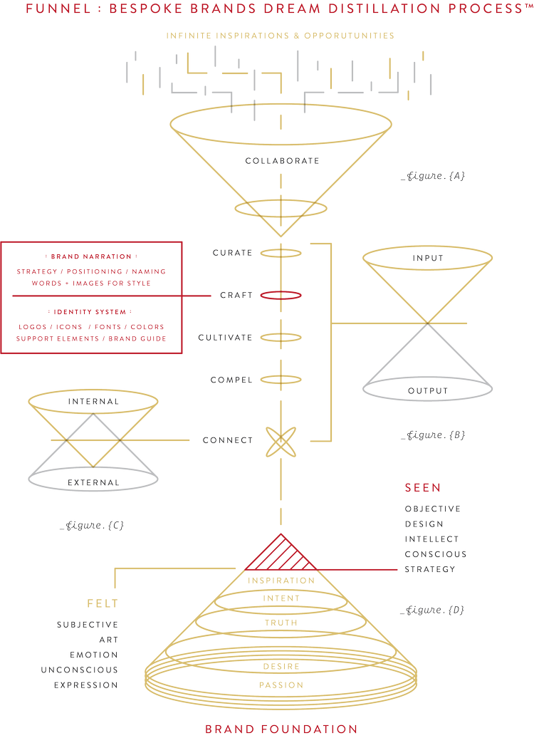 Eric Kass is a one-man design studio under Funnel: Bespoke Brands, and he has over twenty years of graphic design, branding and packaging experience. I love his work, and how fun and vibrant it is but also his collaborative style of approach to case studies. He has created his own design process to solve creative briefs (shown below), which I think is very unique and systematic.