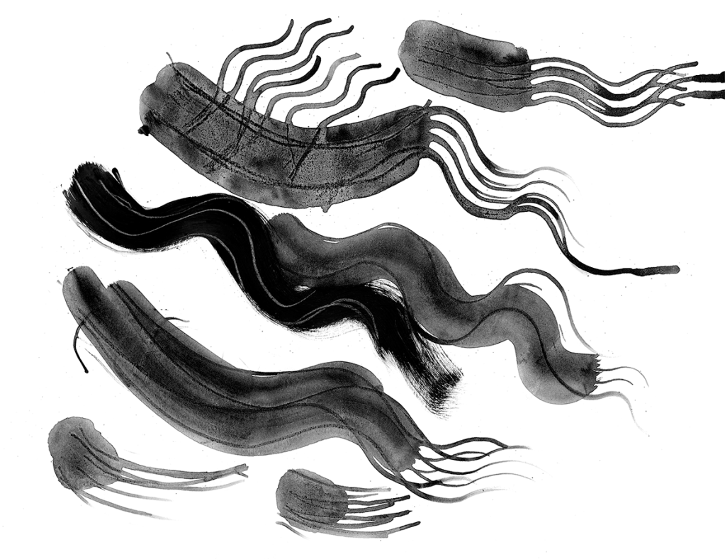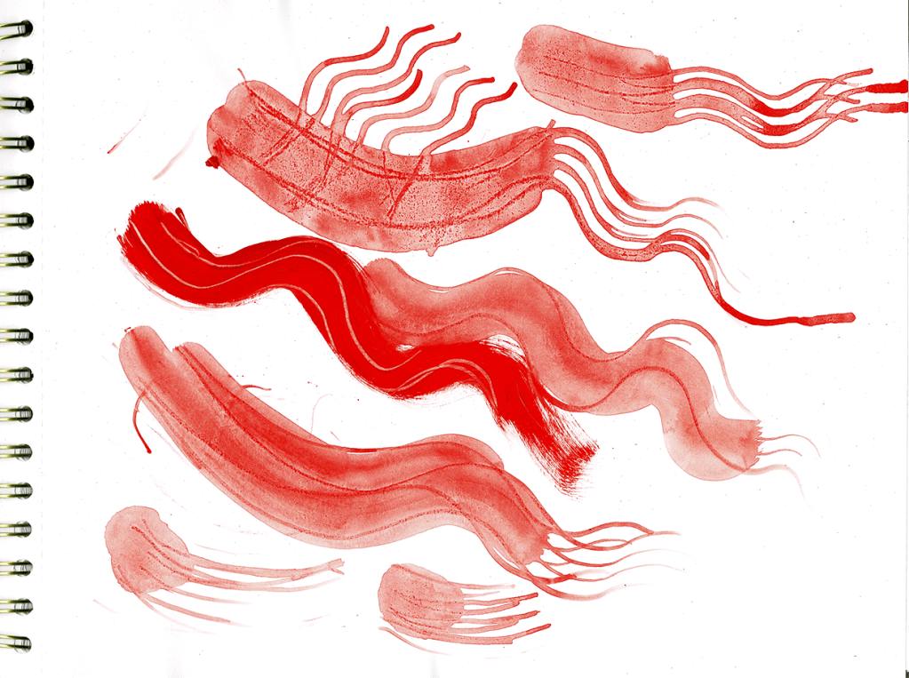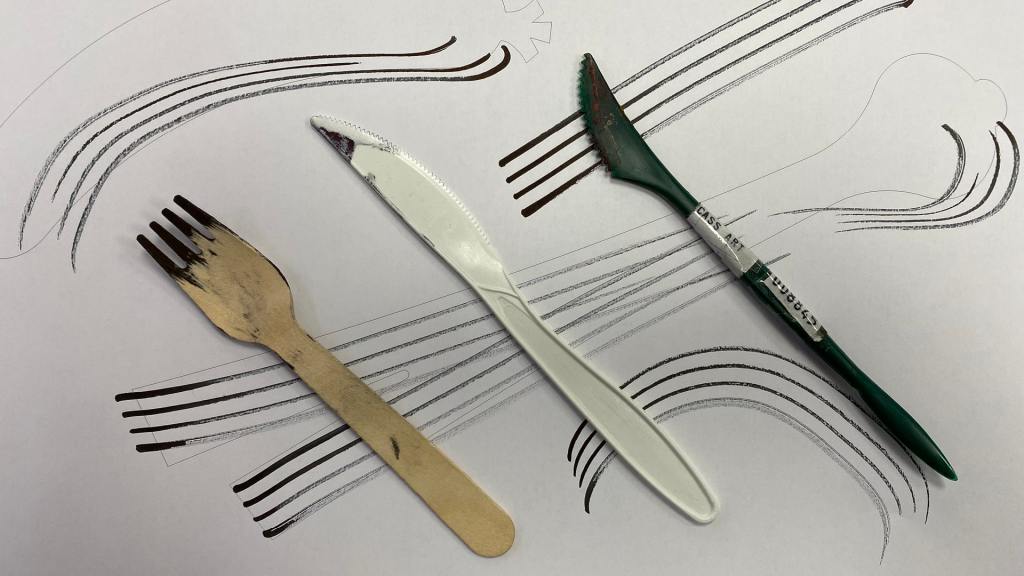For my project, I used a wooden fork from a fish and chips takeaway to create textures, adding a bit of British culture. I painted with red gouache, using my fingers to smudge parts and create spontaneous textures. I also leveraged the gouache’s flexible, opaque quality to let some of the watercolour paper’s texture show through.