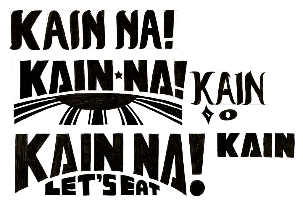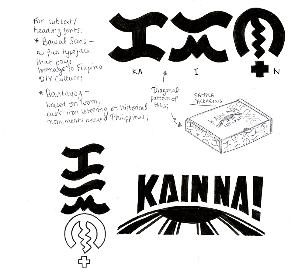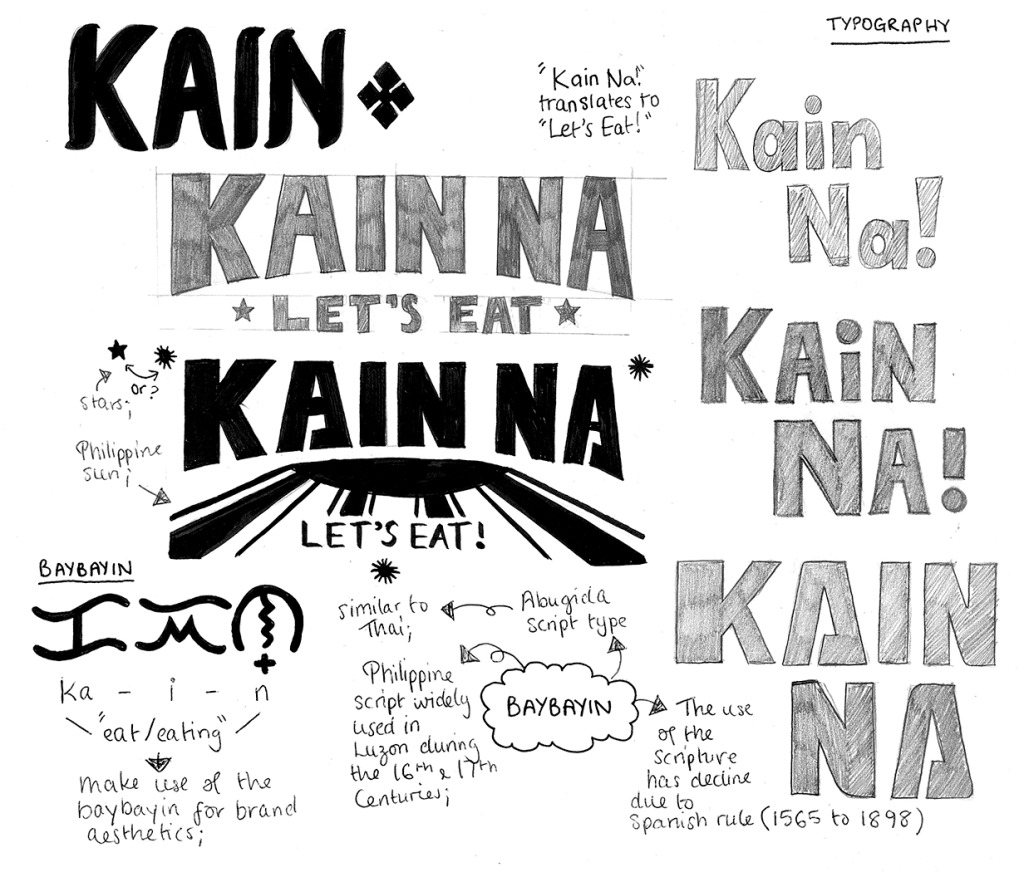 To advance my project, I began sketching ideas for a potential logo. It was important to me to include the Filipino food experience and its cultural significance. In an average Filipino household, we have a phrase to announce when the family should gather to enjoy a meal together: “Kain Na!” (pronounced as KAH – EEN – NAH) This universal phrase means “Let’s Eat!” in Tagalog and extends to the entirety of the Philippines. Although the direct translation is Eat (Kain) Now (Na), it simply announces that it is time to eat, without specifying a particular time of day. Therefore, it is commonly used when food is ready and on the table.